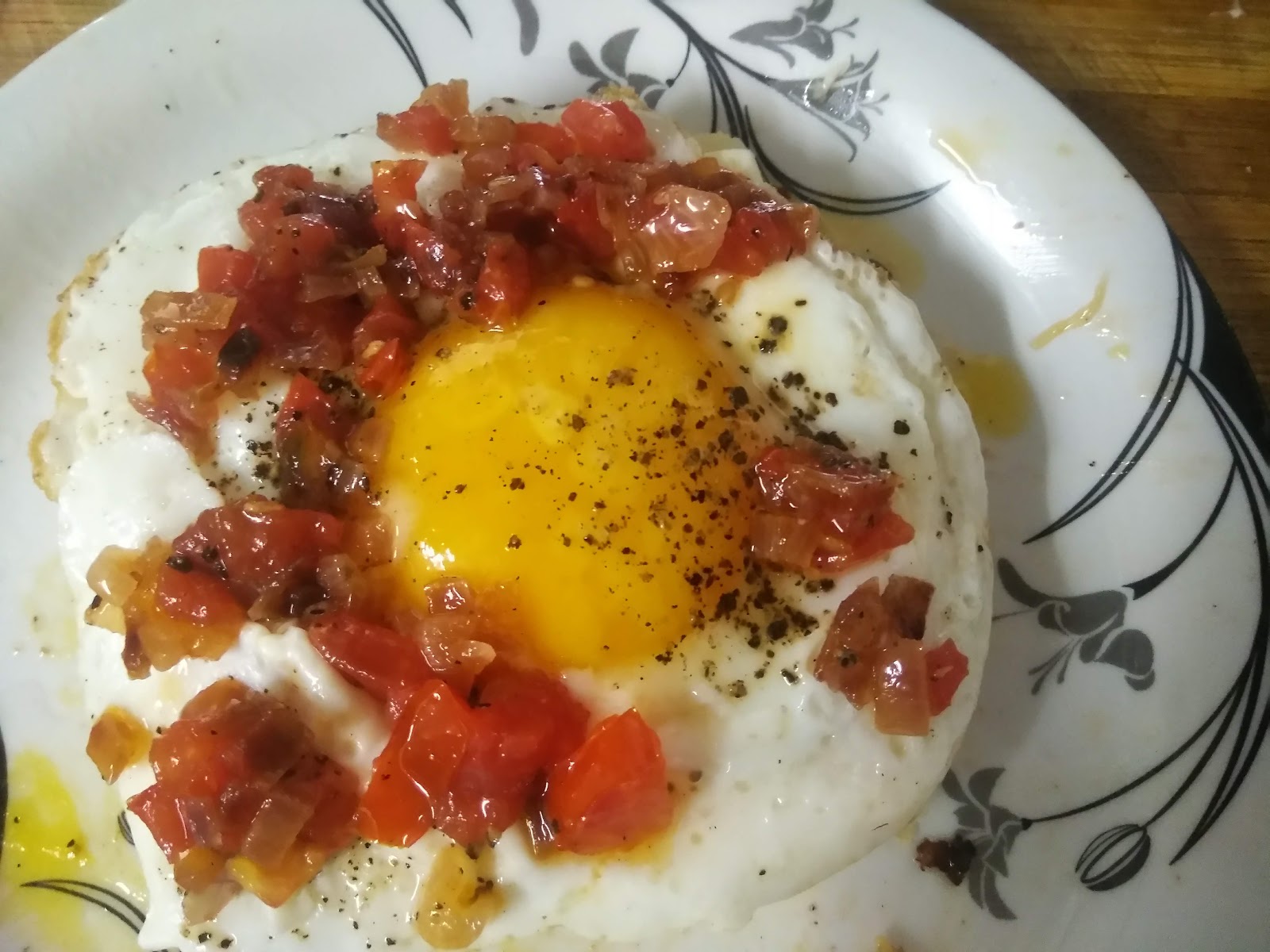 6. Make poach egg, add salt and pepper and place this hot egg over cheese slice. Top it with onion-tomato mix.